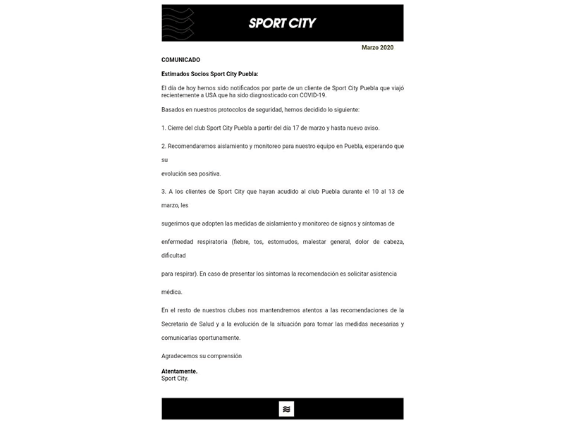 El gimnasio Sport City, ubicado en Palmas Plaza Puebla, anunció que a partir de este martes 17 de marzo suspenderá sus actividades luego de que un socio que viajó a Estados Unidos dio positivo a Covid-19, mejor conocido como coronavirus.