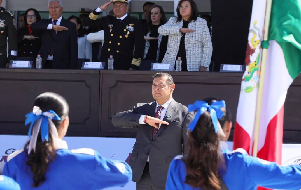 Como parte de la ceremonia, se realizó un enlace vía remota con la presidenta de México, Claudia Sheinbaum, quien desde la Ciudad de México, tomó protesta de bandera a 920 escoltas de las 31 entidades federativas, así como a 80 planteles de la capital del país y 56 escoltas de las Fuerzas Armadas. En cumplimiento de la Ley sobre el Escudo, la Bandera y el Himno Nacional, se realizó el abanderamiento de tres escoltas: de la Escuela Secundaria Federal Número Uno “Presidente Cárdenas”, del Bachillerato General Plantel Azteca Puebla y del Centro Escolar “José María Morelos y Pavón”. Asimismo, integrantes del Ejército Mexicano entregaron la enseña nacional a 27 escoltas de secundarias y bachilleratos del estado, lo que fortalece el respeto a los símbolos patrios entre miles de estudiantes.