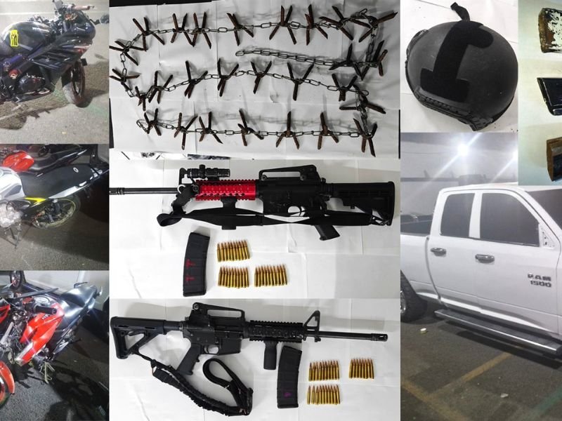 Entre los indicios asegurados en Tecamachalco, destacan más de 360 cartuchos útiles de diversos calibres, seis armas largas, entre ellas una ametralladora, siete cargadores, un casco balístico, equipo táctico, dispositivos de obstrucción vehicular, tres motocicletas y una camioneta.