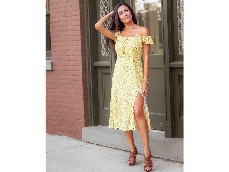 Para dar una sensación de calidez y amabilidad, no hay mejor color que el amarillo. Además de que te regalará mucha luminosidad para tu cita especial. Disfruta de un vestido largo y floreado para cautivar a tu pareja y déjate consentir. Te aseguramos comodidad y elegancia, si lo acompañas con tenis o con tacones.