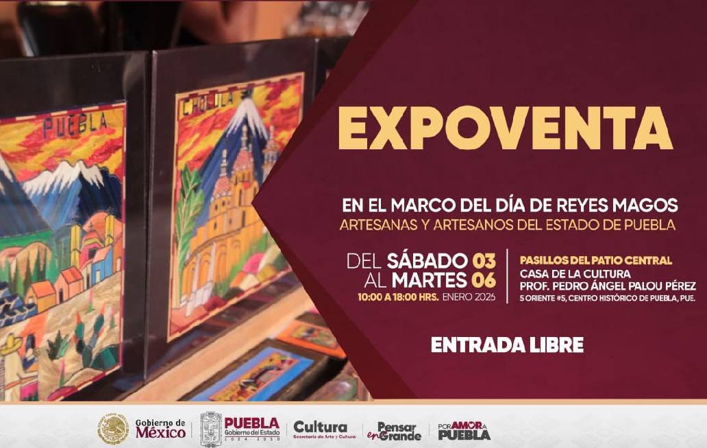 En el marco de la celebración del Día de Reyes, la Secretaría de Arte y Cultura invita a la ciudadanía a visitar la Expoventa Artesanal, que se realizará del sábado 3 al lunes 6 de enero, en un horario de 10:00 a 18:00 horas, en la Casa de Cultura “Prof. Pedro Ángel Palou Pérez” ubicada en el Centro Histórico de la capital poblana.
