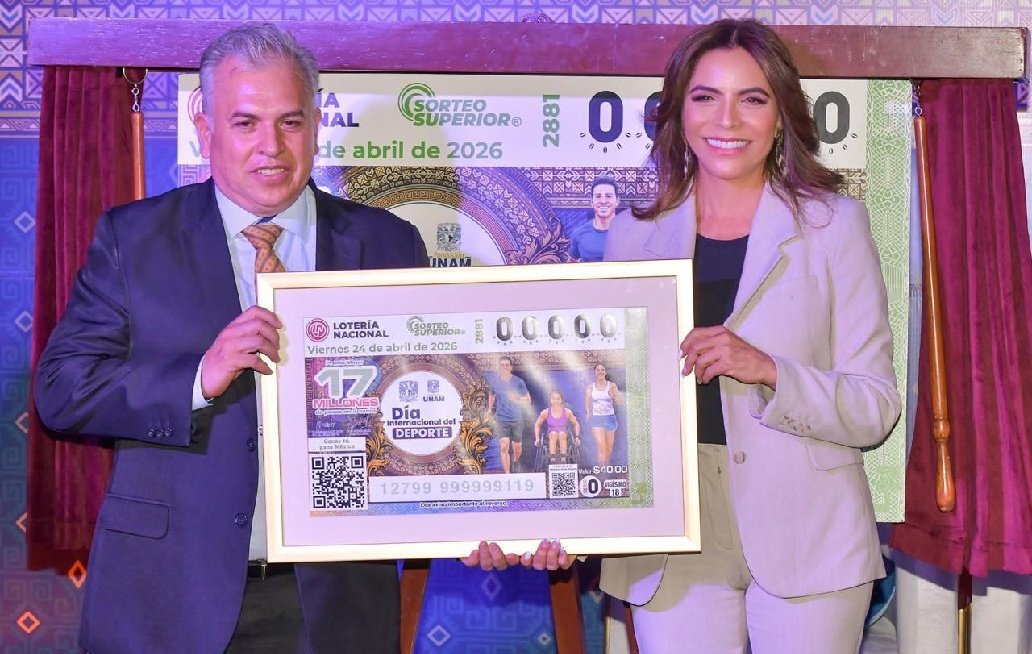 Con motivo del Día Internacional del Deporte para el Desarrollo y la Paz, Olivia Salomón, directora general de Lotería Nacional; Fernando Macedo Chagolla, secretario de Servicio y Atención a la Comunidad Universitaria de la UNAM; y Dionisio A. Meade, presidente del Consejo Directivo de Fundación UNAM, develaron el billete del Sorteo Superior No. 2881, diseñado para destacar esta efeméride que nos recuerda el papel fundamental del deporte y la actividad física en la promoción de los derechos humanos, el desarrollo económico y social, y la paz mundial.
