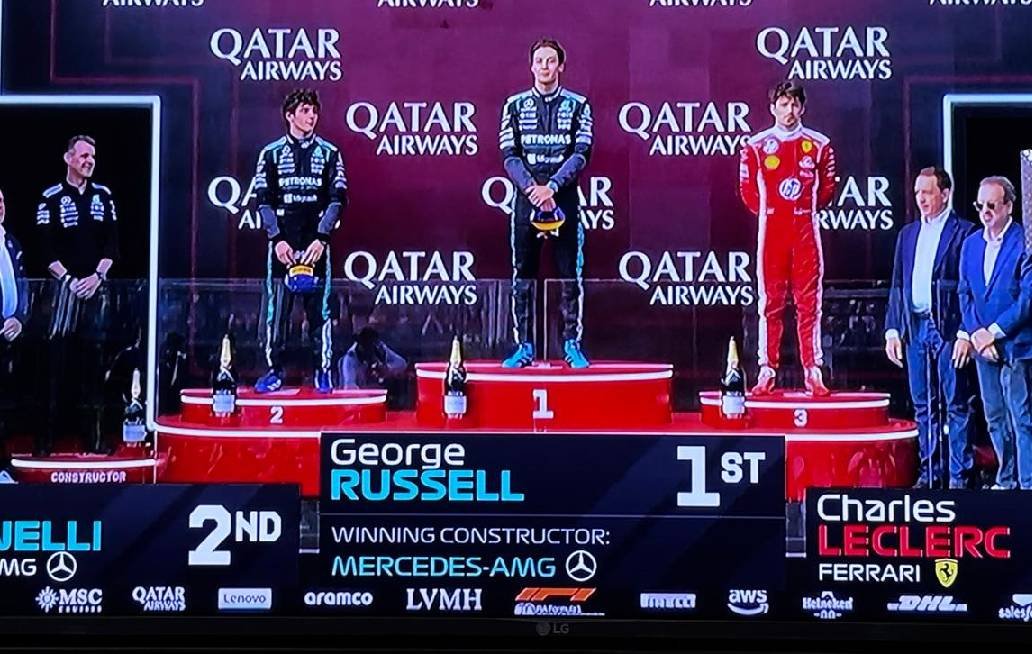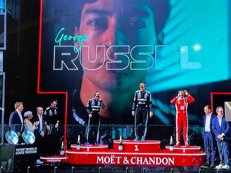 Los que se subieron al pódium fueron los pilotos de Mercedes que hicieron el 1-2, George Russell y su compañero Kimi Antonelli (con tan solo 18 años de edad) y en el tercer lugar el recién casado Charles Leclerc de la escudería Ferrari y le siguió su compañero Lewis Hamilton.
