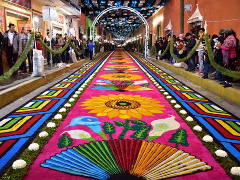 Cada año, durante agosto, en Huamantla se celebra “La Noche en que nadie duerme”, en la que sus habitantes participan –de la noche del 14 para amanecer el 15– en el diseño y armado de hermosos tapetes de aserrín y flores que sirven para interconectar las calles y templos más importantes de la población por donde pasará la imagen de la patrona de Huamantla.