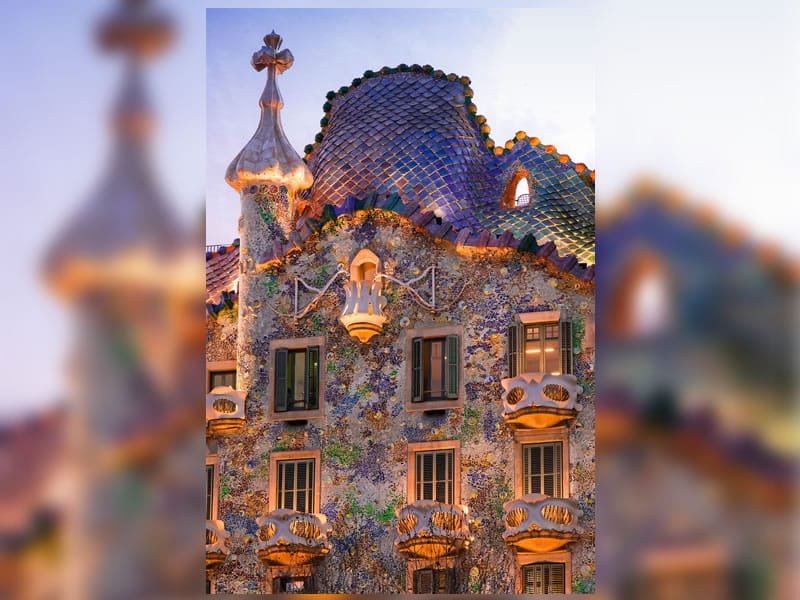 Su arquitecto, Gaudí, dejó la impronta de ese animal fabuloso y de su leyenda: las escamas del dragón recubren la azotea; mientras que la espada de San Jorge sobresale del tejado y los balcones parecen calaveras.